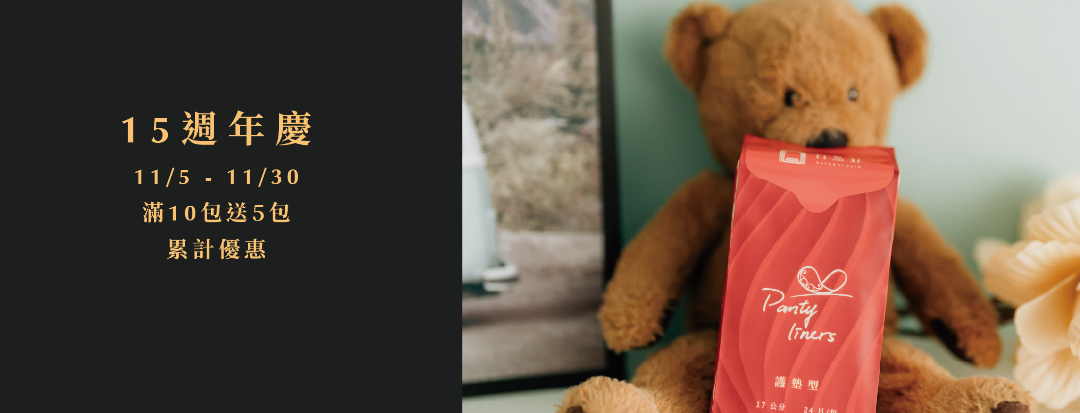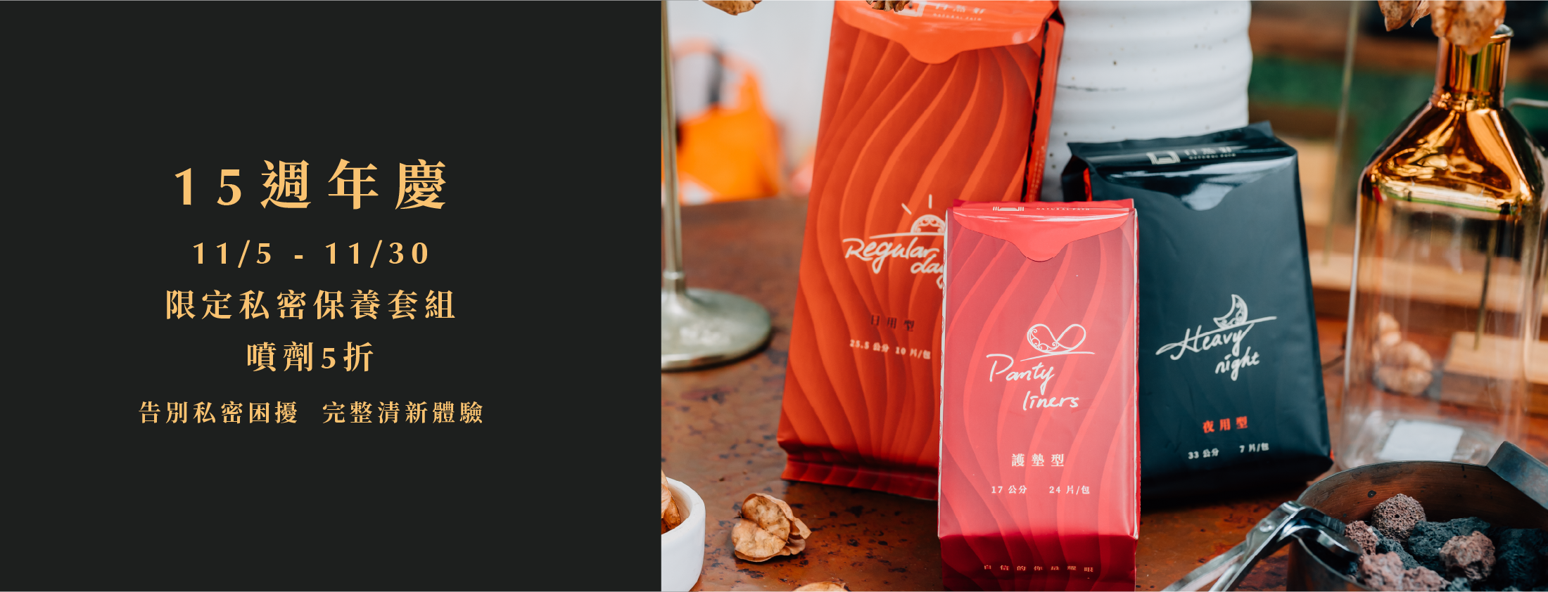 【15周年慶】Natural Path 15歲囉!為了感謝各位長久以來的支持,我們準備了超棒的回饋,11/5 - 11/30只要下單每滿10包就送5包衛生棉,下方還有私密處噴劑的5折套組,快來逛逛吧!
